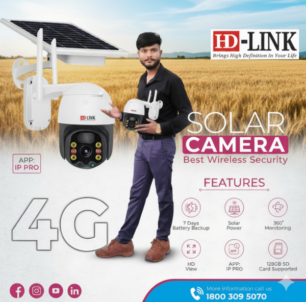 The HD-LINK SolarGuard 360 is a state-of-the-art wireless security camera designed for modern home and business surveillance. Equipped with 4G connectivity, it works without Wi-Fi — perfect for remote areas. Its built-in solar panel ensures 24/7 operation without manual charging, while the 7-day battery backup gives uninterrupted protection even during cloudy days.