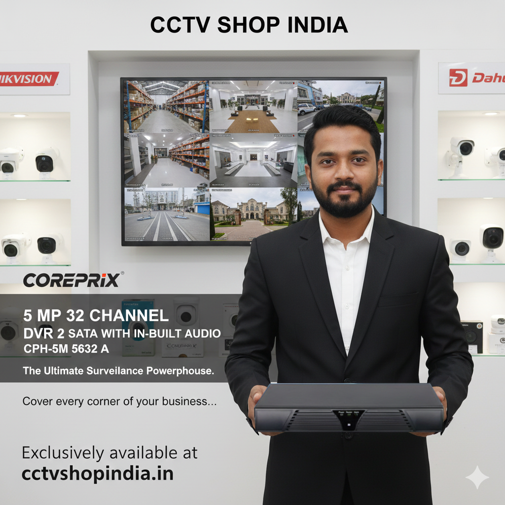 The Ultimate Surveillance Command Center. Manage your entire security network with the Coreprix CPH-5M 5632 A. Featuring 32 Channels of high-definition 5MP recording, Dual SATA ports for massive storage, and In-Built Audio, this DVR is designed for large-scale operations like malls, factories, and large estates. High-speed processing meets industrial-grade reliability.