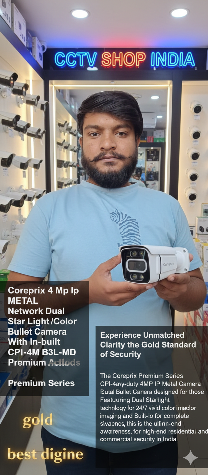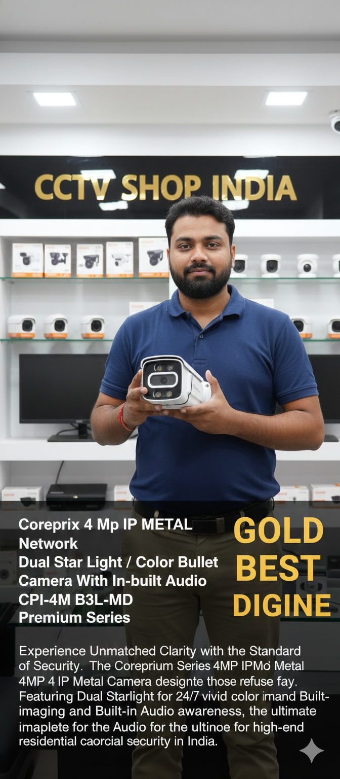 Experience Unmatched Clarity with the Gold Standard of Security. The Coreprix Premium Series CPI-4M B3SL-MD is a heavy-duty 4MP IP Metal Bullet Camera designed for those who refuse to compromise on safety. Featuring Dual Starlight technology for 24/7 vivid color imaging and Built-in Audio for complete situational awareness, this is the ultimate choice for high-end residential and commercial security in India.