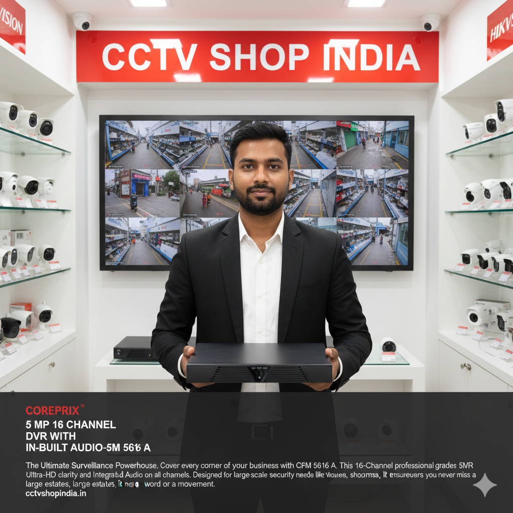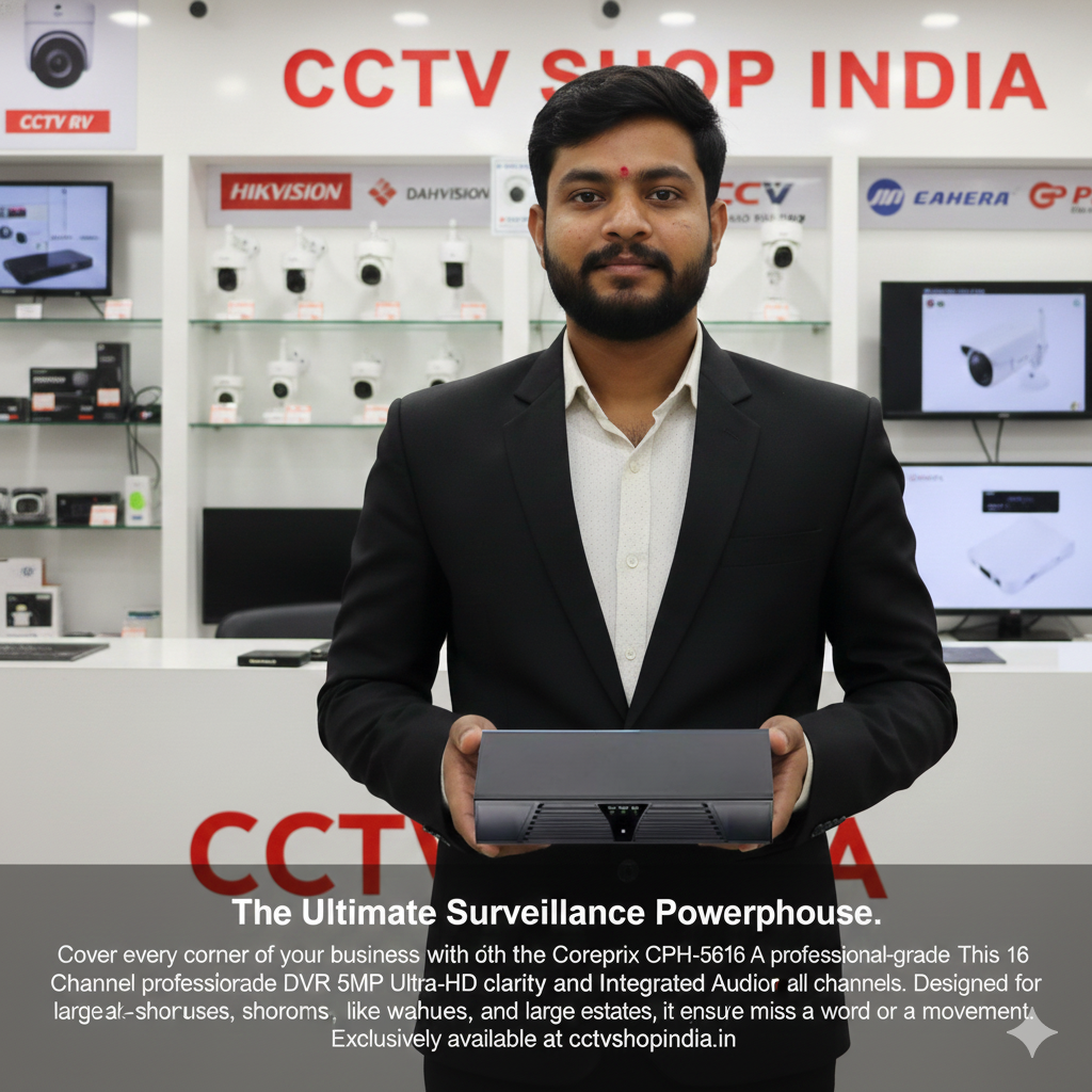 The Ultimate Surveillance Powerhouse. Cover every corner of your business with the Coreprix CPH-5M 5616 A. This 16-Channel professional-grade DVR offers 5MP Ultra-HD clarity and Integrated Audio on all channels. Designed for large-scale security needs like warehouses, showrooms, and large estates, it ensures you never miss a word or a movement. Exclusively available at cctvshopindia.in.